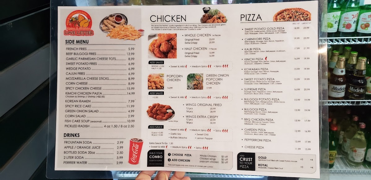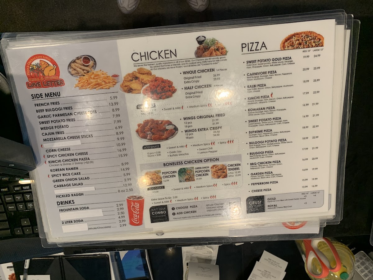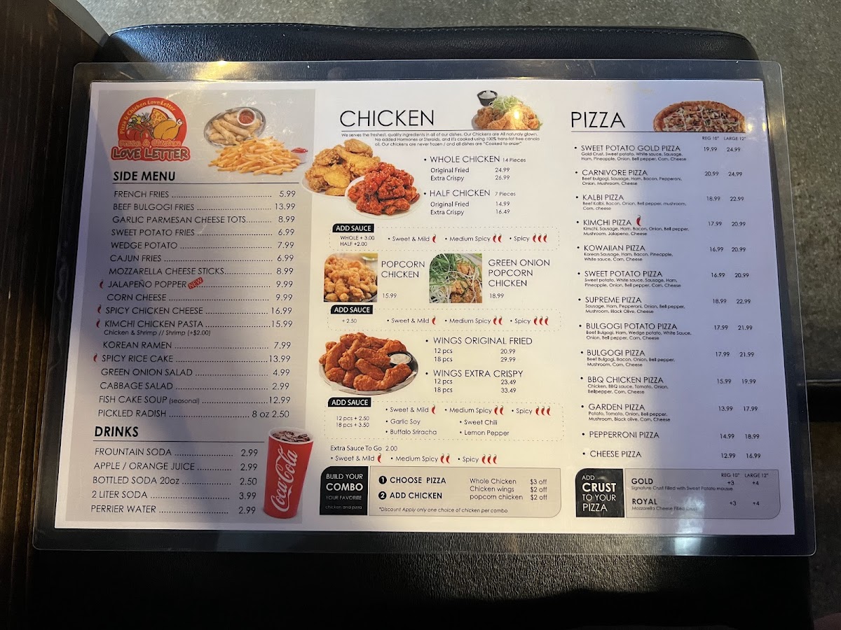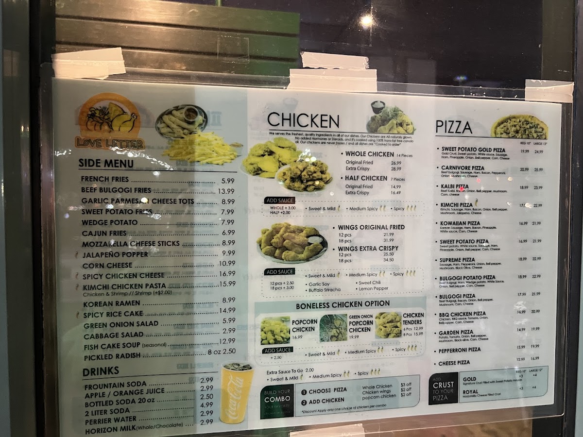 The menu at Love Letter Pizza & Chicken offers a combination of Korean-style dishes alongside classic and specialty pizzas. It includes a variety of poultry options such as Korean Fried Chicken, BBQ Chicken, chicken wings, and popcorn chicken, catering to those seeking savory chicken dishes. Pizza selections range from traditional options like Pepperoni Pizza to unique varieties such as Sweet Potato Pizza, Kalbi Pizza with Royal Crust, and Bulgogi Potato Pizza.