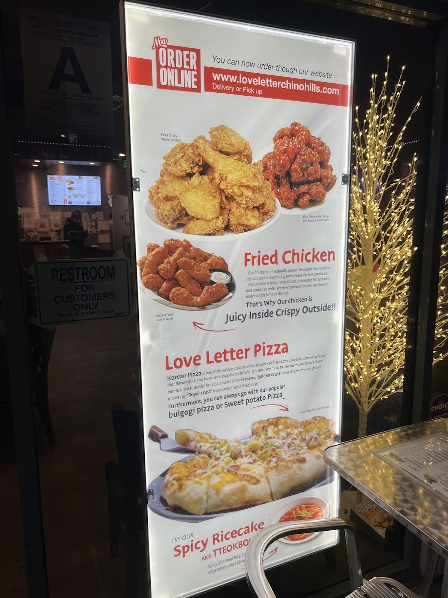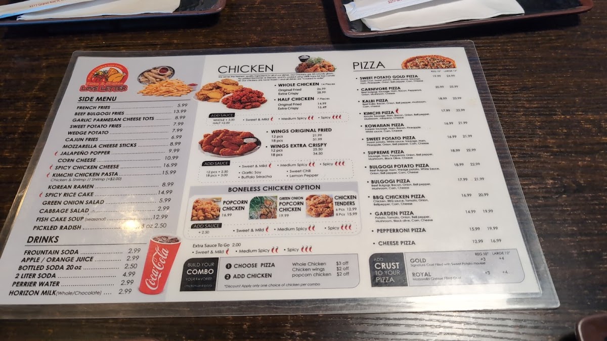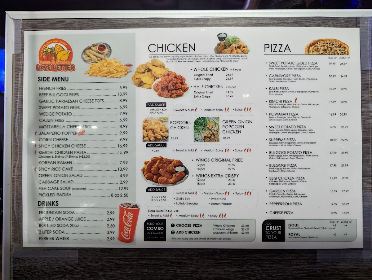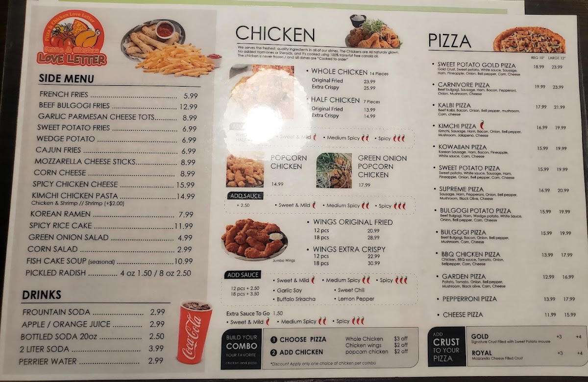 The menu at Love Letter Pizza & Chicken offers a combination of Korean-style dishes alongside classic and specialty pizzas. It includes a variety of poultry options such as Korean Fried Chicken, BBQ Chicken, chicken wings, and popcorn chicken, catering to those seeking savory chicken dishes. Pizza selections range from traditional options like Pepperoni Pizza to unique varieties such as Sweet Potato Pizza, Kalbi Pizza with Royal Crust, and Bulgogi Potato Pizza.