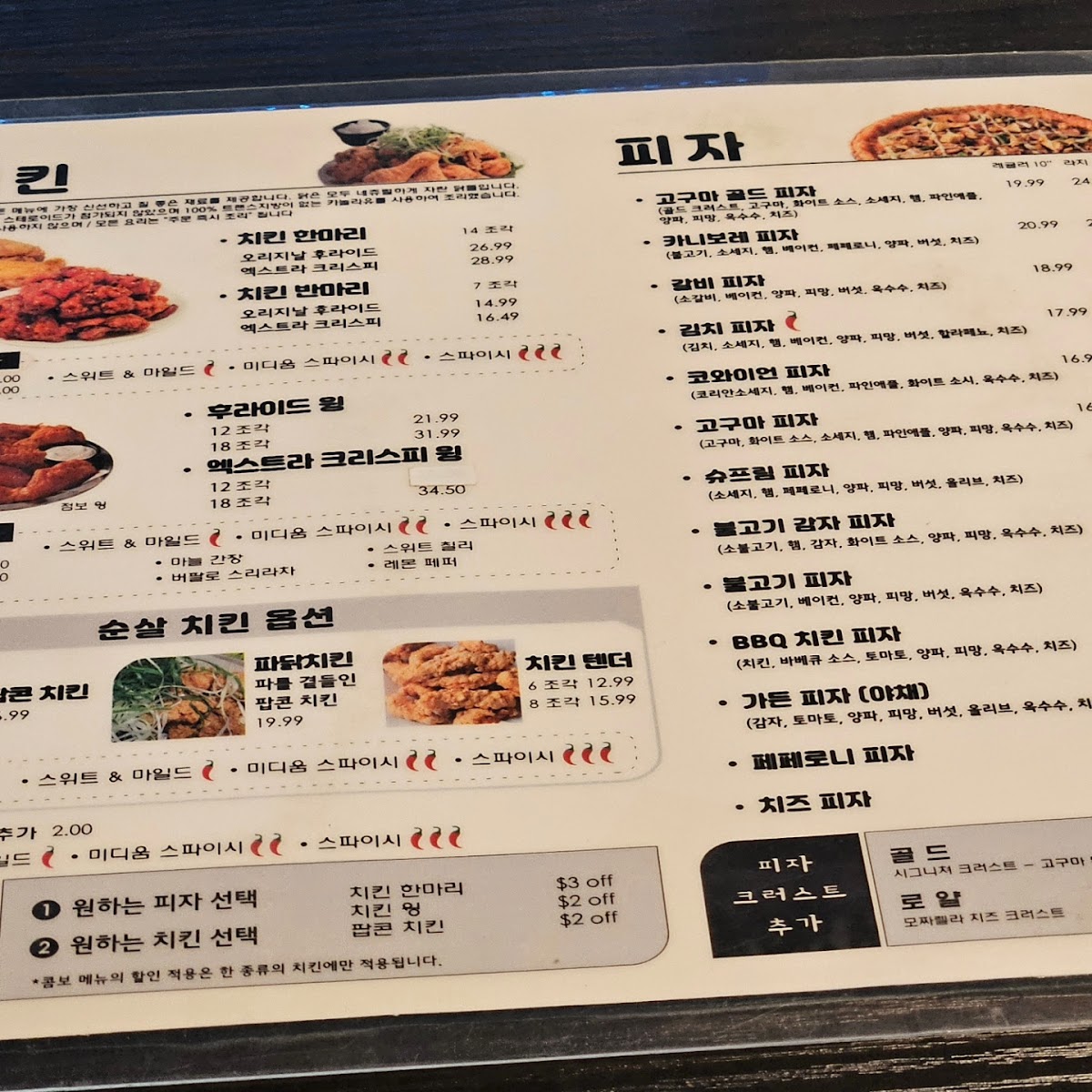 This menu is suitable for casual dining occasions, including quick orders and takeout. It provides a range of choices for group sharing or individual meals, accommodating varying preferences between Korean traditional flavors and pizza cuisine.